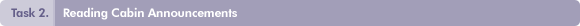 This task contains three (3) different types of cabin announcements. Each announcement occurs during one of the different activities of a cabin crew's in-flight service namely: providing flight information, welcome announcement, safety measures demonstration, take-off, seatbelt sign-off, cabin service, duty free sales, movie, documentation, approach, landing, transit information, farewell message and deplaning. The examinee is required to enunciate these announcements clearly and loudly. |