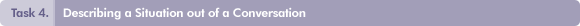 This task primarily measures his understanding of the given conversation (Comprehension), his ability to provide details and information to complete his description (Interaction), and the ability to paraphrase in order to provide a clear description of the situation (Vocabulary).