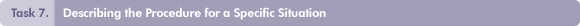 This task should examine the examinee's ability to understand the situation by addressing what is required based on the given procedures (Comprehension). It should also measure his ability to deliver an immediate, informative, and appropriate response based on the given procedures (Interaction). It should also measure the ability of the examinee to use the appropriate words to deliver his message effectively to the receiver (Vocabulary)