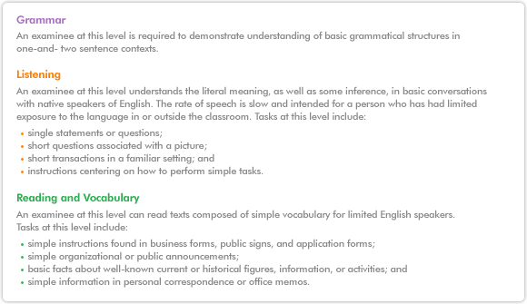 | This level assesses the abilities of a test taker to handle basic communicative functions. The test taker is capable of basic formulaic expressions such as those used in greetings and introductions, and is successful with basic communicative transactions. Although a test taker at this level has had only limited exposure to English outside of the classroom, he/she is able to use English in simple communication with native speakers in a narrow range of tasks. |