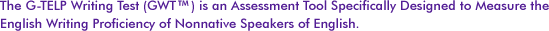 | The GWT complements the General Tests of Language Proficiency (G-TELP™) in assessing the English proficiency of nonnative English speakers. Together, these tests form a powerful battery of measuring tools that can meaningfully help people achieve higher levels of proficiency in the English language. |