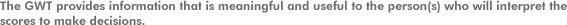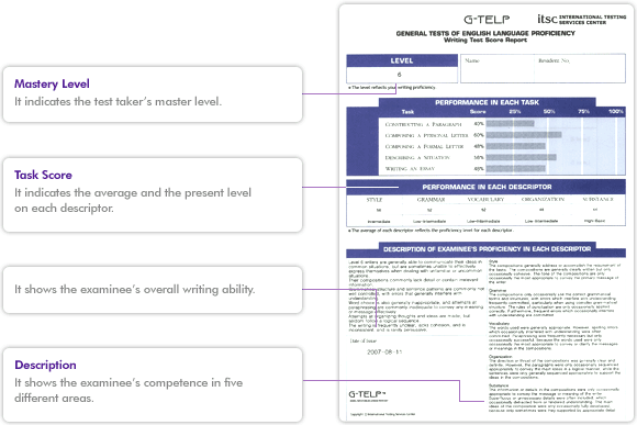 | Other tests of English language proficiency, which are norm-referenced, report a single score or subtest scores that indicate an examinee's place on a scale that the test is using. Such represents a population of examinees who are taking the test for a specific purpose (e.g., for admission to college in the United States). In contrast, the GWT assesses general English-writing proficiency with an emphasis on the functional ability to communicate in writing. Functional ability involves a person's ability to carry out particular, well-defined tasks in the language (e.g., describing oneself, comparing two options, or supporting an opinion with specific examples). |