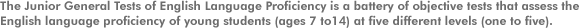 | Levels one and two were developed to address the needs of very young learners of English, ages 7 to 10. The language at these levels is highly simplified, and structures are very basic. Levels three, four, and five are parallel to the G-TELP battery, since they were developed using the same criteria and standards for the G-TELP. However, the subject matter of the Junior G-TELP tests reflect school-related and personal topics and situations that are familiar to students of a young age group. The Junior G-TELP test sections vary somewhat in length, as in the G-TELP. The test items resemble those of the G-TELP, though reflecting school-related and personal topics. The test results are displayed in the same format as the G-TELP, in both an individual Score Report and a group Summary Score Report. |